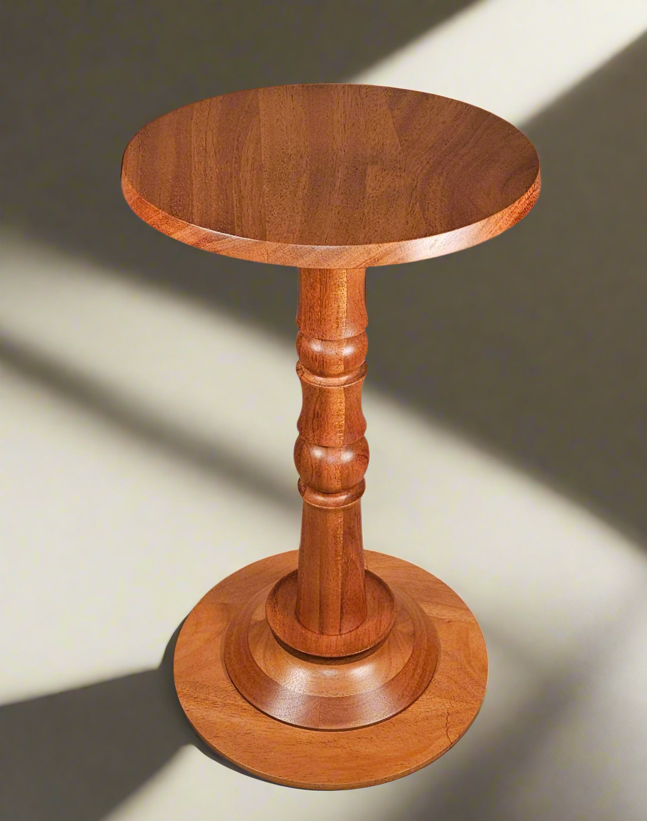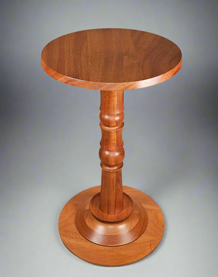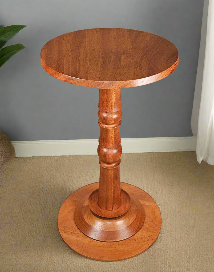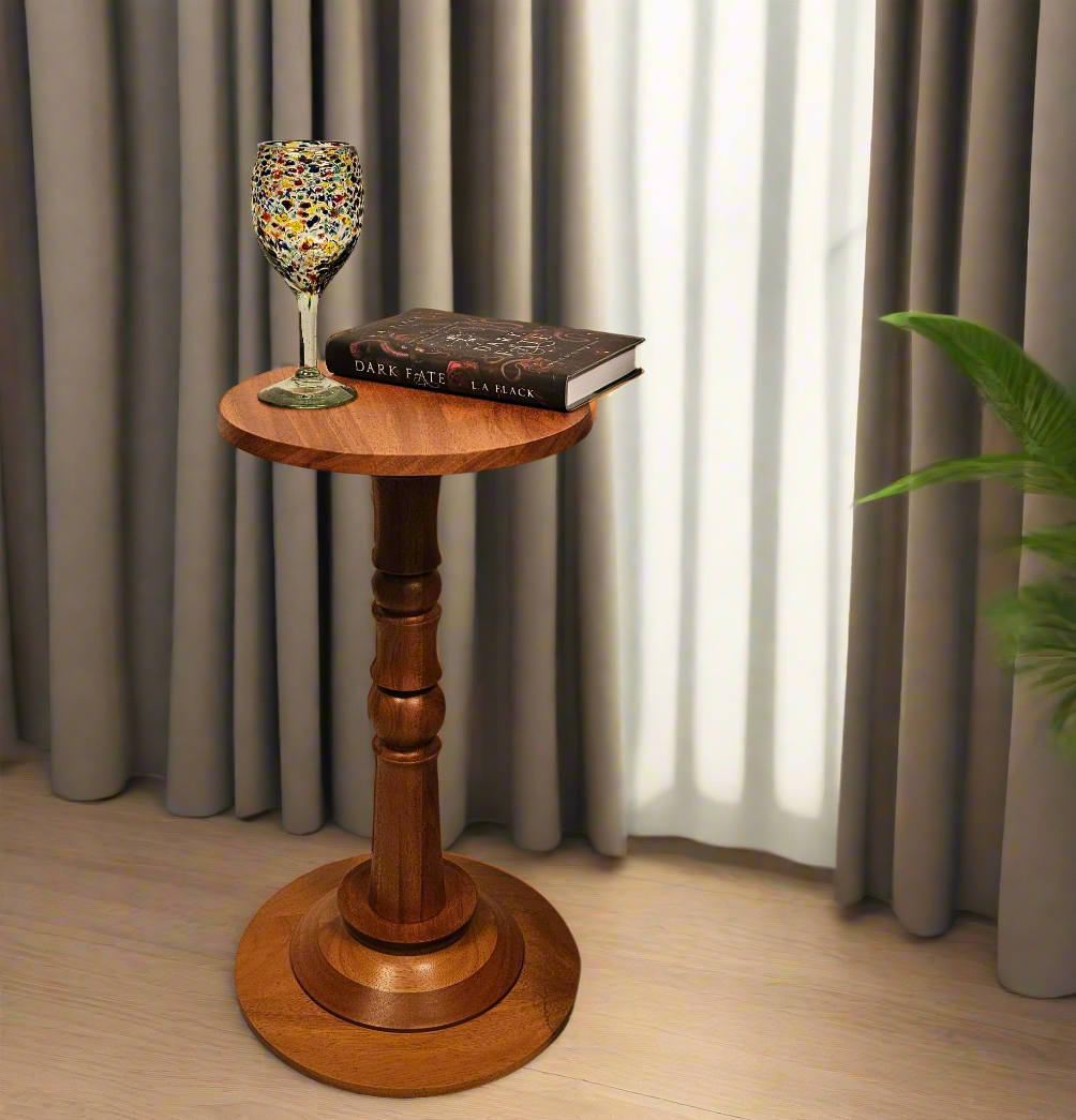 Crafted from the finest African Mahogany, this beverage table is a masterpiece of artisanship. Its exquisite, handcrafted design adds elegance to any space. Made with premium quality materials, this table is made of solid wood, hand sanded and finished with a durable satin lacquer finish. Perfect for entertaining or as a statement piece. Table dimensions: 20 inches high by 12-inch diameter.