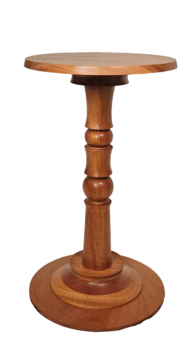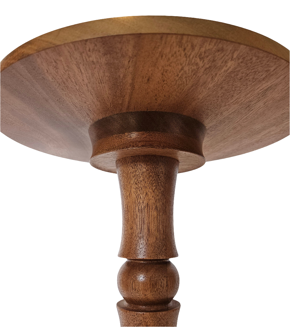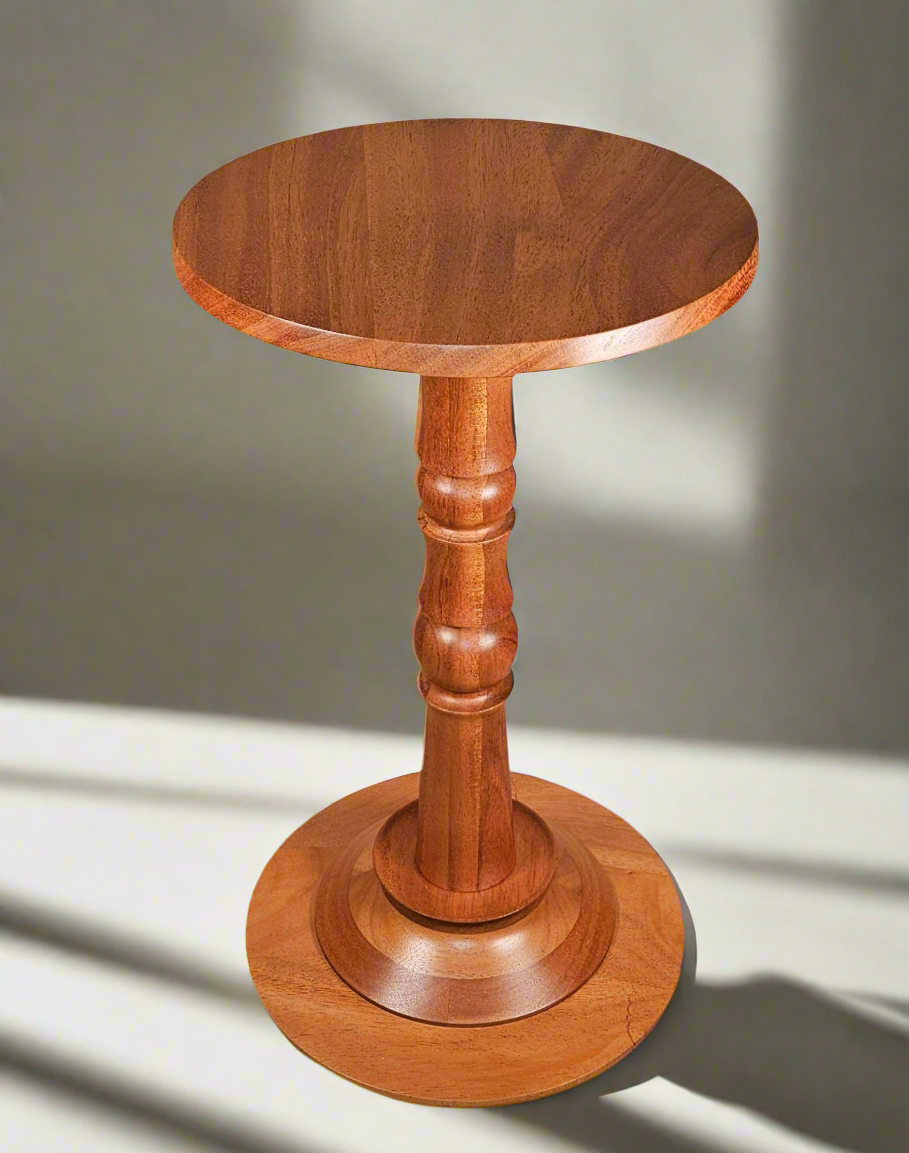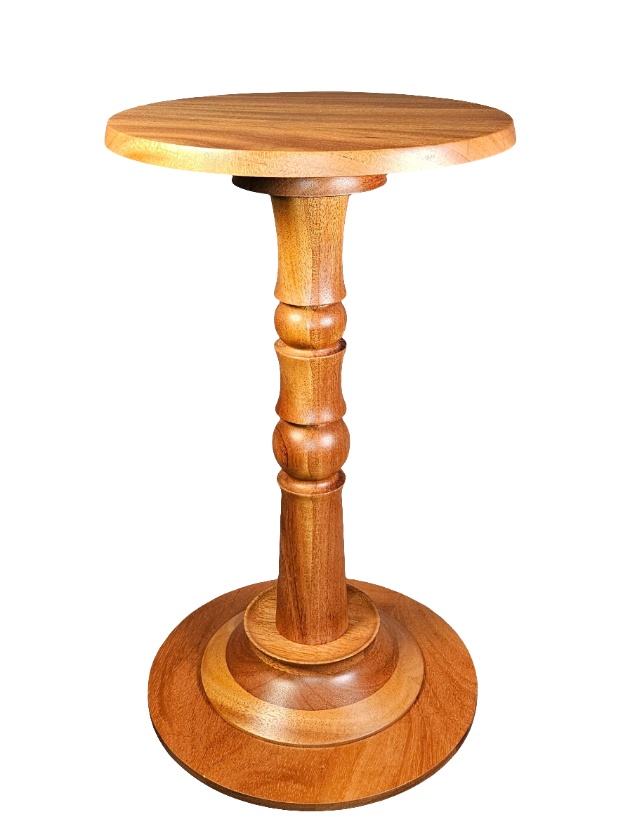 Crafted from the finest African Mahogany, this beverage table is a masterpiece of artisanship. Its exquisite, handcrafted design adds elegance to any space. Made with premium quality materials, this table is made of solid wood, hand sanded and finished with a durable satin lacquer finish. Perfect for entertaining or as a statement piece. Table dimensions: 20 inches high by 12-inch diameter.