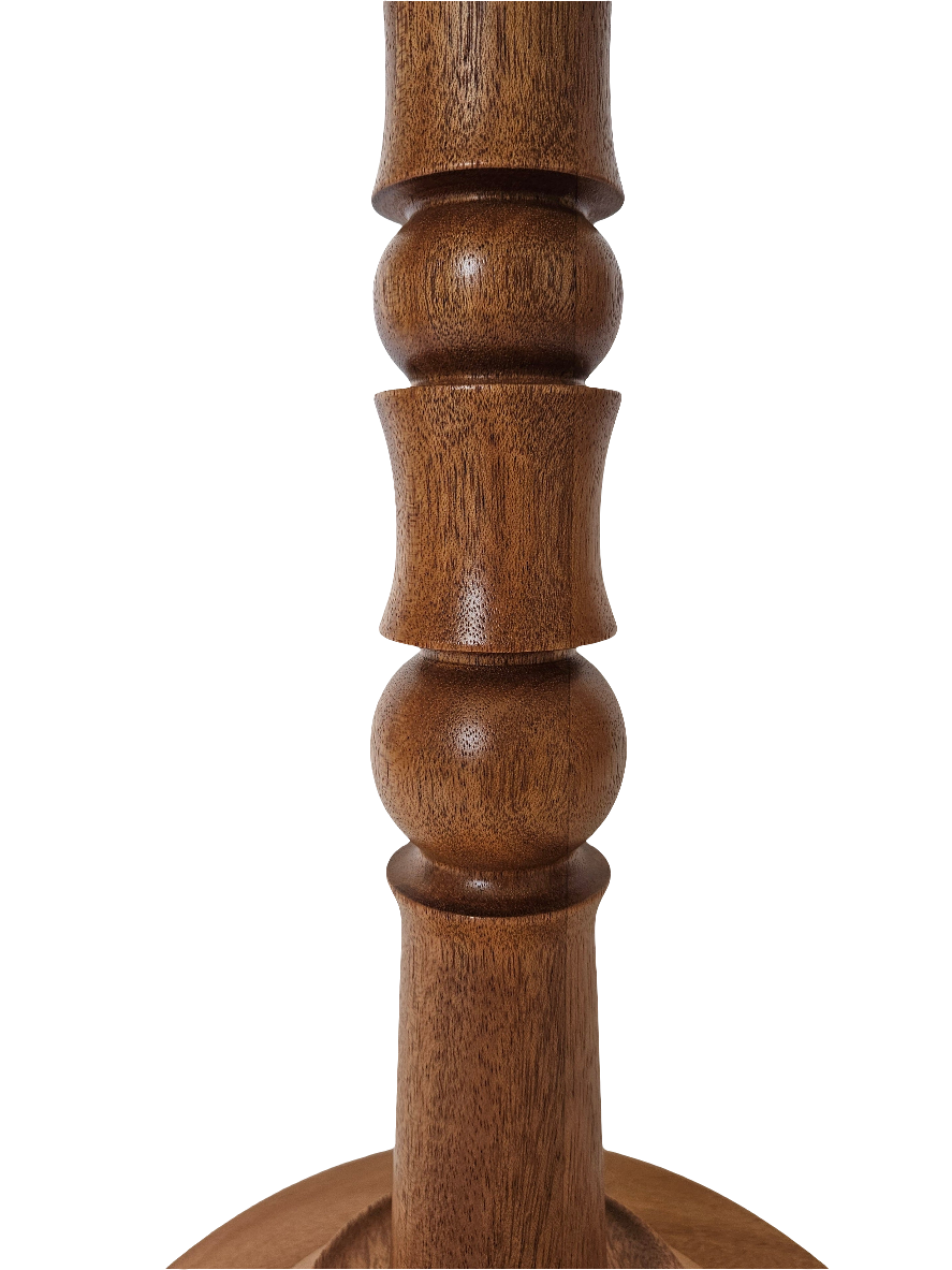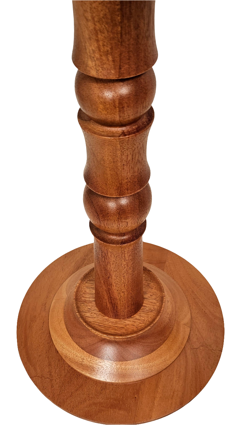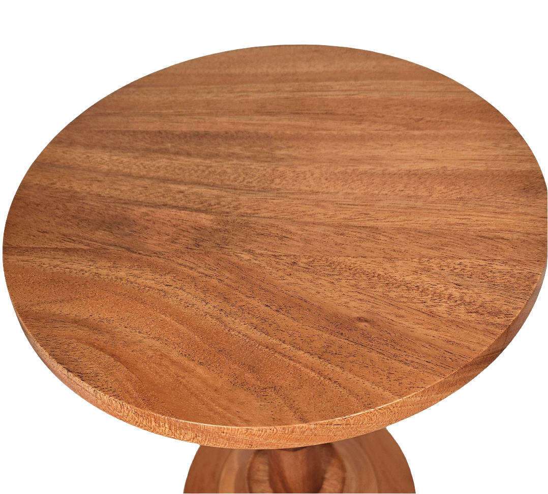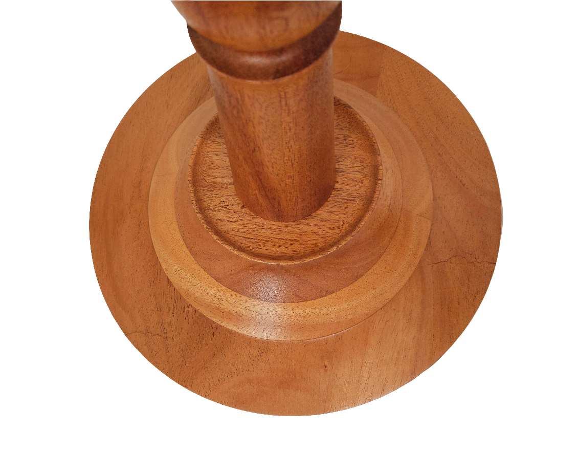 Crafted from the finest African Mahogany, this beverage table is a masterpiece of artisanship. Its exquisite, handcrafted design adds elegance to any space. Made with premium quality materials, this table is made of solid wood, hand sanded and finished with a durable satin lacquer finish. Perfect for entertaining or as a statement piece. Table dimensions: 20 inches high by 12-inch diameter.