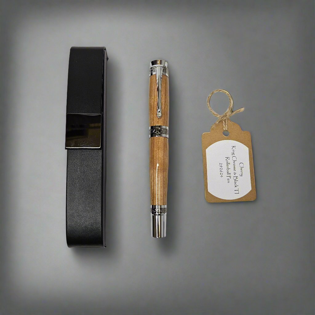 Cherry Wood Rollerball King Pen with Chrome and Black Titanium Hardware