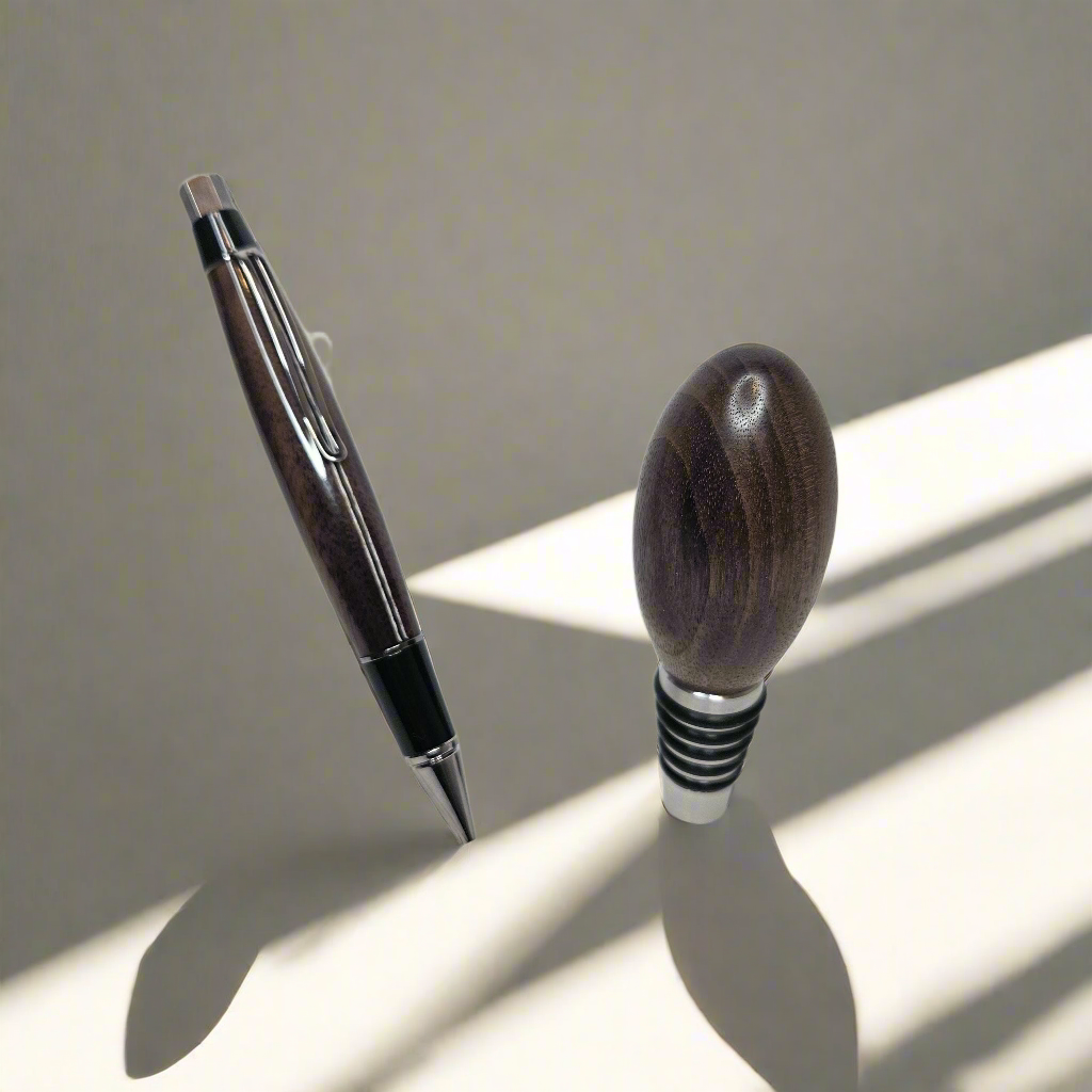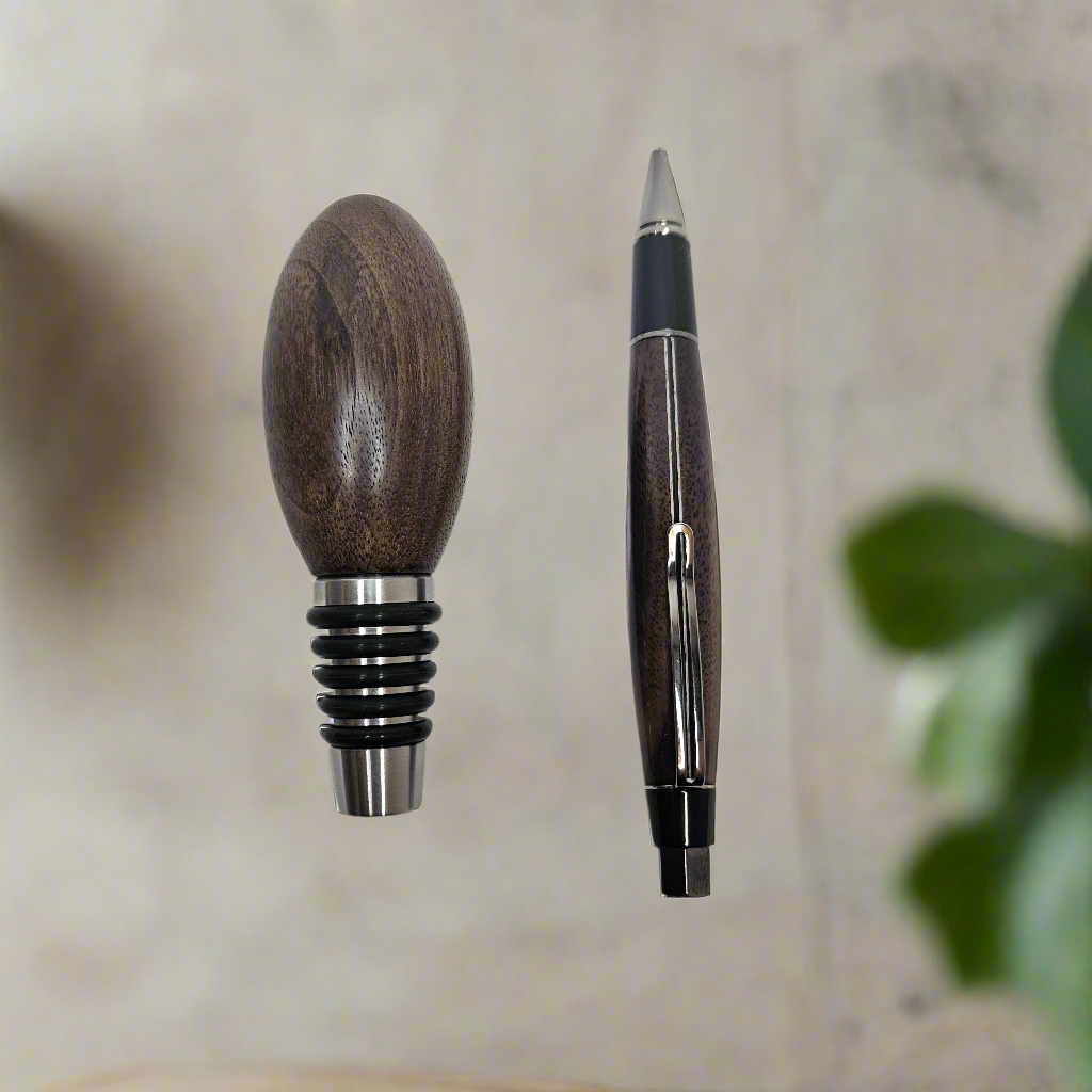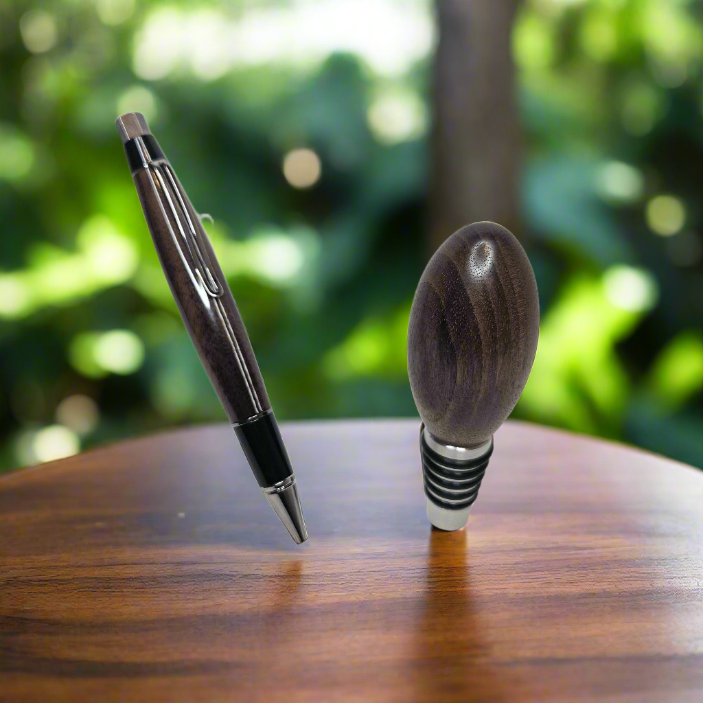 Custom Walnut Pen & Whiskey Stopper Gift Set – Perfect for Gifting! This stunning Custom Walnut Pen & Whisky Stopper Gift Set combines two exquisite handcrafted pieces in one thoughtful, functional, and elegant gift. Perfect for whisky enthusiasts, writers, or anyone who appreciates fine craftsmanship, this set makes a memorable present for birthdays, anniversaries, holidays, or any special occasion. Each item is meticulously handmade from rich, durable walnut wood, known for its deep, warm tones and unique grain patterns. Personalize both the pen and whisky stopper with custom engravings to add a special touch to your gift. Gift Set Includes: 1. Custom Walnut Pen Material: Premium walnut wood with a stunning natural grain that makes each pen unique Design: Smooth twist action for effortless writing, with a comfortable and ergonomic grip Hardware: Polished chrome accents to complement the rich walnut finish Customizable: Personalize with an engraved name, message, or special date 2. Why You’ll Love It: Handcrafted Quality: Both the pen and whisky stopper are carefully handmade, ensuring attention to detail and superior craftsmanship. Elegant & Functional: This set is perfect for those who appreciate both style and practicality. The pen is ideal for everyday use, while the whisky stopper preserves your favorite drink with elegance. Customizable & Thoughtful: Make it personal with custom engravings that will turn these items into cherished keepsakes. Perfect for Gifting: Whether for a birthday, anniversary, retirement, or holiday, this gift set is designed to impress. Order Now: Celebrate the special moments in life with this handcrafted Walnut Pen & Whisky Stopper Gift Set. Personalize it today and give a gift that blends luxury, functionality, and lasting memories! Due to the natural variation in walnut wood, each piece will have its own unique grain and color, making every pen and stopper truly one-of-a-kind. Handcrafted from premium walnut, this elegant set combines a smooth-writing pen with a sleek whiskey stopper, making it the ideal gift for any occasion.
