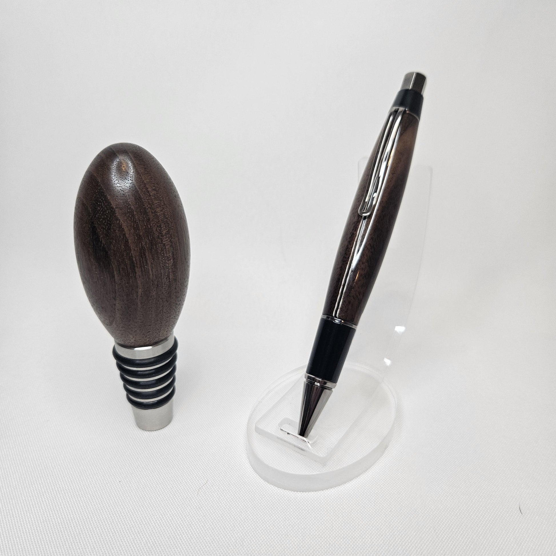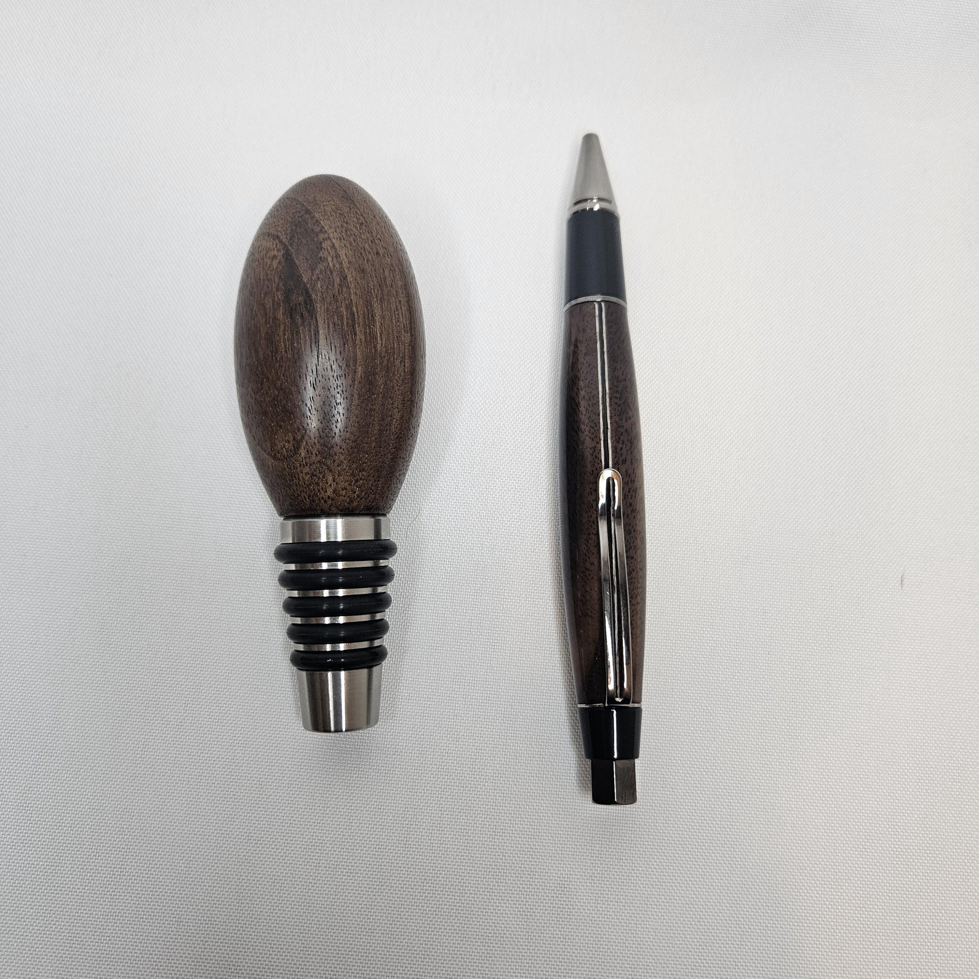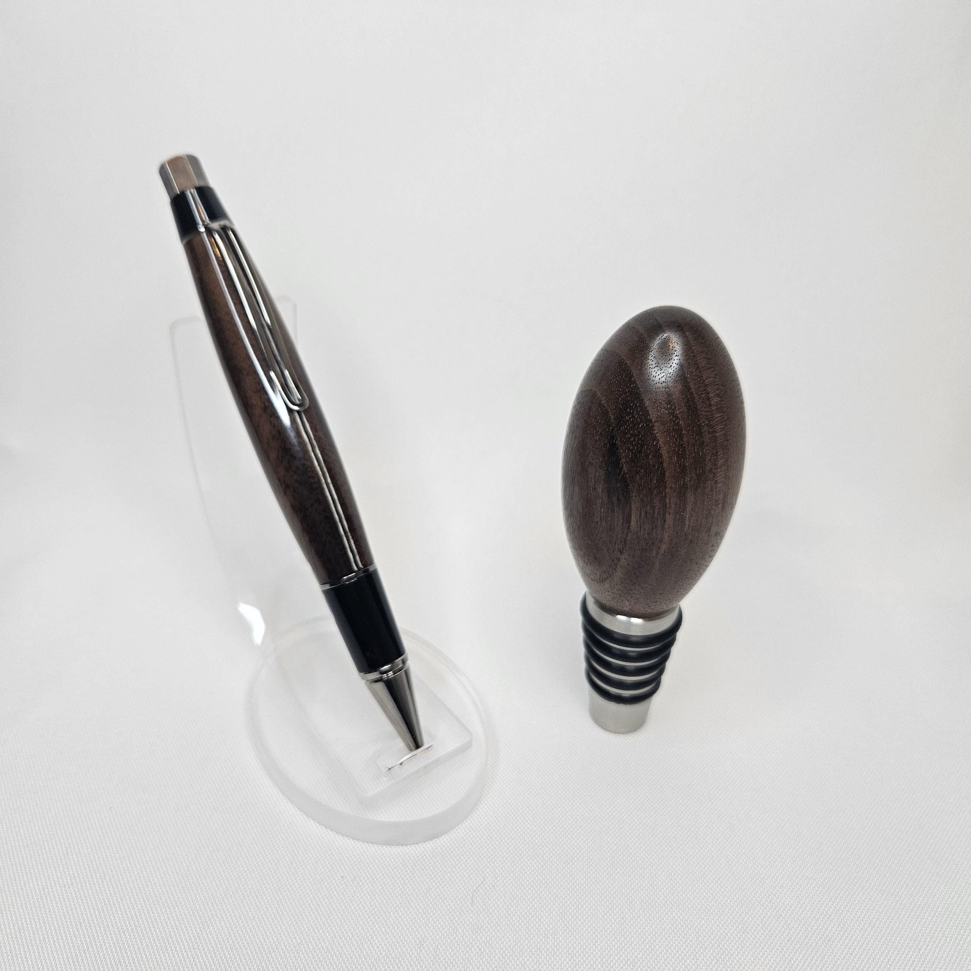 Custom Walnut Pen & Whiskey Stopper Gift Set – Perfect for Gifting! This stunning Custom Walnut Pen & Whisky Stopper Gift Set combines two exquisite handcrafted pieces in one thoughtful, functional, and elegant gift. Perfect for whisky enthusiasts, writers, or anyone who appreciates fine craftsmanship, this set makes a memorable present for birthdays, anniversaries, holidays, or any special occasion. Each item is meticulously handmade from rich, durable walnut wood, known for its deep, warm tones and unique grain patterns. Personalize both the pen and whisky stopper with custom engravings to add a special touch to your gift. Gift Set Includes: 1. Custom Walnut Pen Material: Premium walnut wood with a stunning natural grain that makes each pen unique Design: Smooth twist action for effortless writing, with a comfortable and ergonomic grip Hardware: Polished chrome accents to complement the rich walnut finish Customizable: Personalize with an engraved name, message, or special date 2. Why You’ll Love It: Handcrafted Quality: Both the pen and whisky stopper are carefully handmade, ensuring attention to detail and superior craftsmanship. Elegant & Functional: This set is perfect for those who appreciate both style and practicality. The pen is ideal for everyday use, while the whisky stopper preserves your favorite drink with elegance. Customizable & Thoughtful: Make it personal with custom engravings that will turn these items into cherished keepsakes. Perfect for Gifting: Whether for a birthday, anniversary, retirement, or holiday, this gift set is designed to impress. Order Now: Celebrate the special moments in life with this handcrafted Walnut Pen & Whisky Stopper Gift Set. Personalize it today and give a gift that blends luxury, functionality, and lasting memories! Due to the natural variation in walnut wood, each piece will have its own unique grain and color, making every pen and stopper truly one-of-a-kind. Handcrafted from premium walnut, this elegant set combines a smooth-writing pen with a sleek whiskey stopper, making it the ideal gift for any occasion.