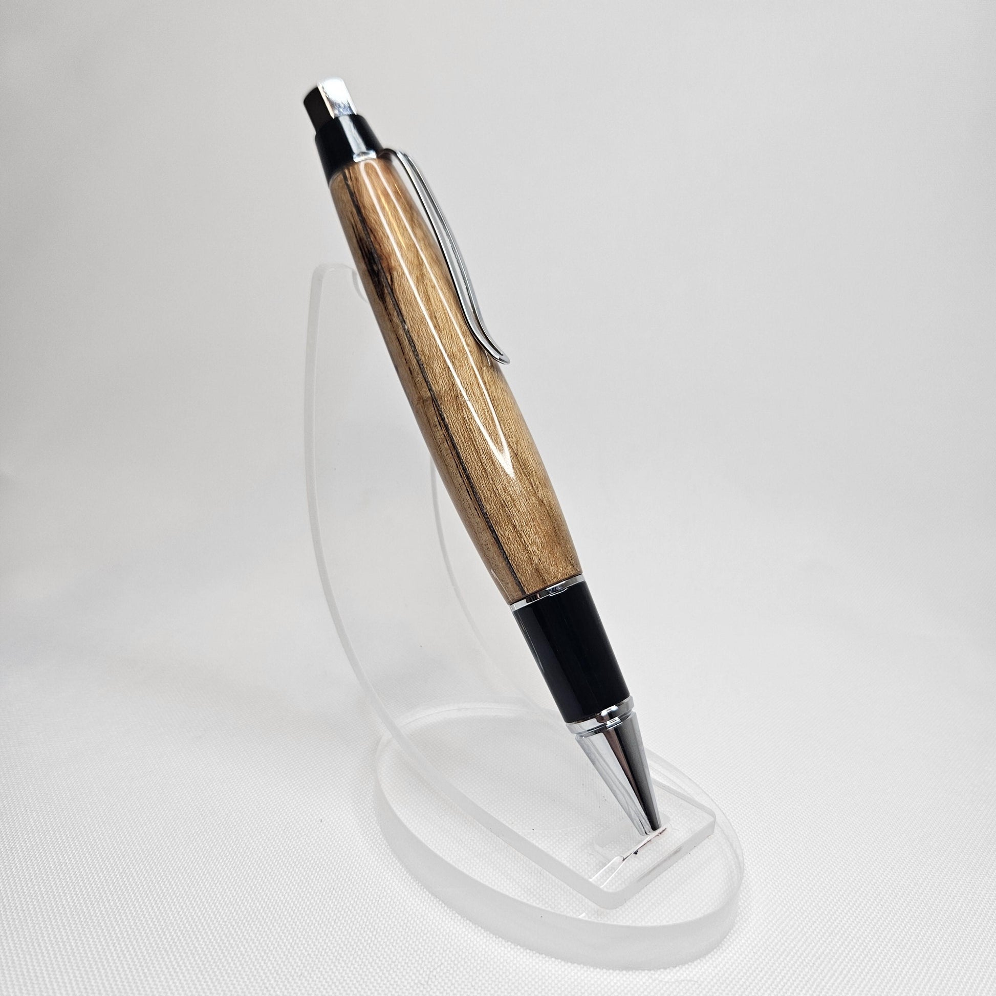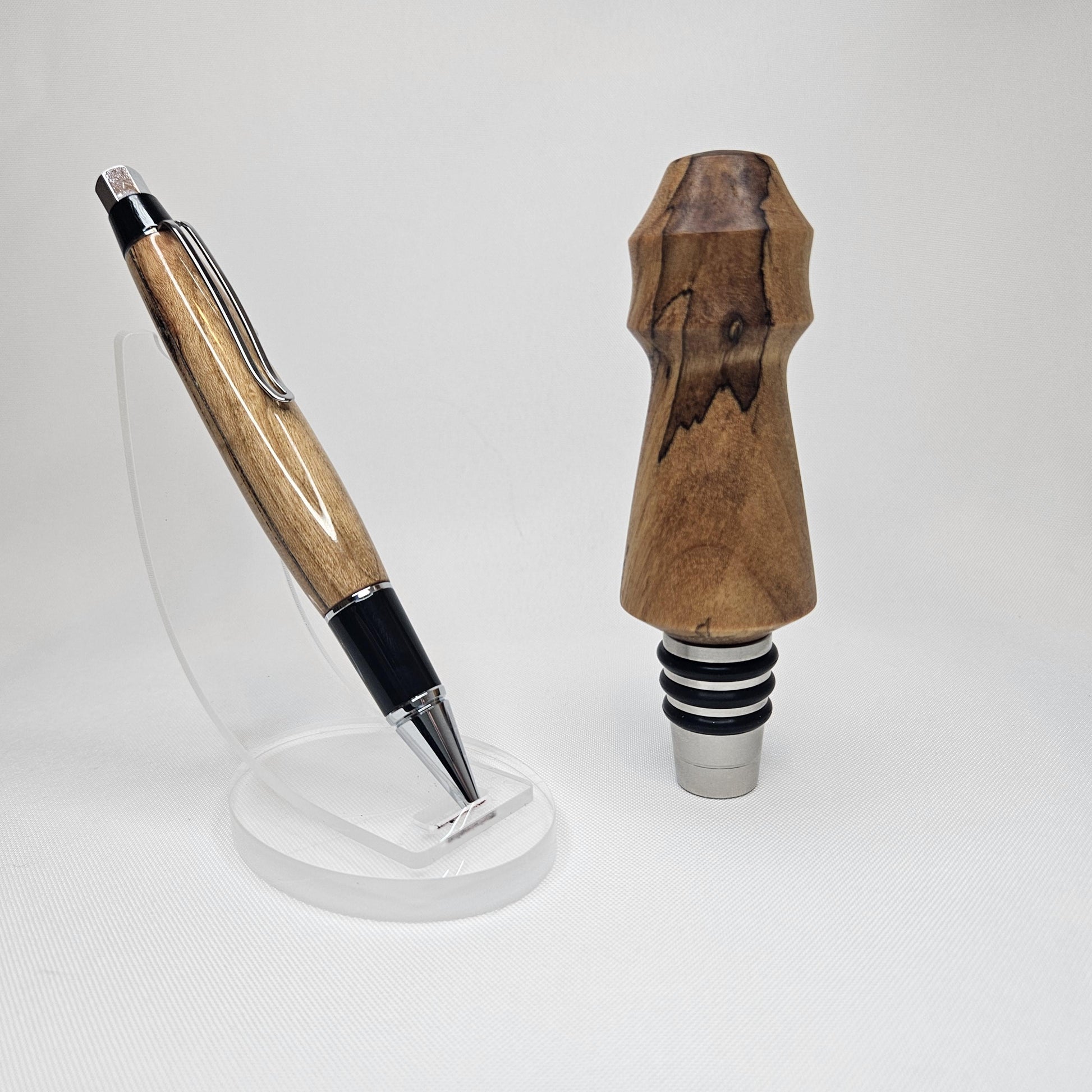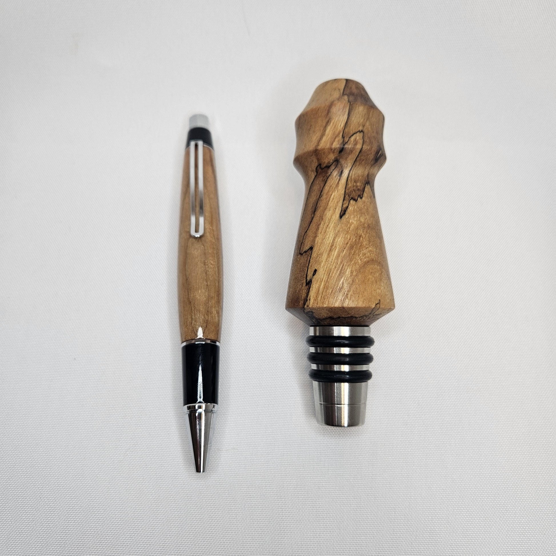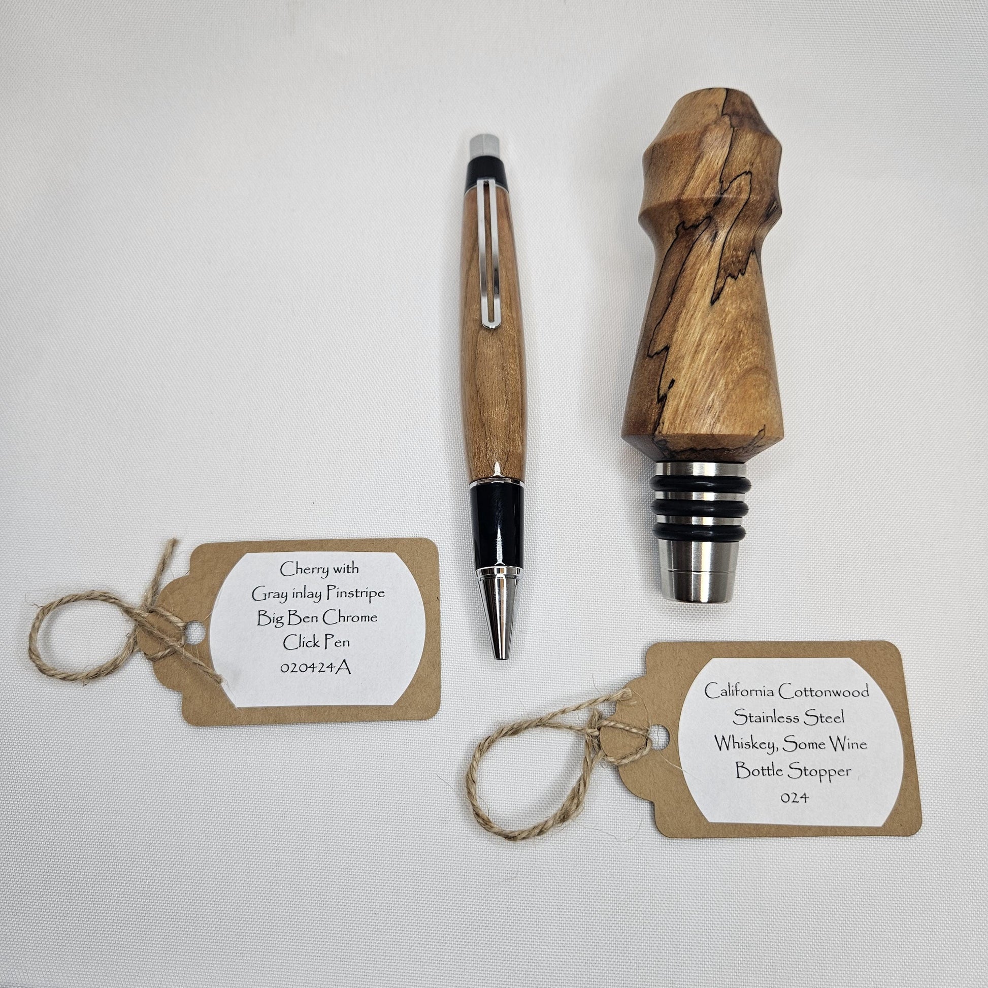 The set features a beautifully turned California Cottonwood Whiskey bottle stopper and a sleek click pen adorned with sophisticated cherry wood with pinstripe detailing. Set Includes: Whisky Bottle Stopper: Made from California Cottonwood, this stopper is designed to preserve your favorite whisky or wine in style, with a smooth finish and a unique, natural wood grain. Pen: A sleek, easy-to-use pen made from cherry wood, featuring a refined pinstripe detail for a touch of modern elegance. Perfect for everyday use or as a desk accessory. Features: Wood Type: Cherry for the pen, Cottonwood for the stopper, both known for their durability and rich grain. Finish: Hand-sanded and polished for a smooth, glossy surface that highlights the natural beauty of the wood. Unique Pinstripe Design on Pen: Adds a refined, modern touch to the traditional craftsmanship of the pen. Perfect Gift: Ideal for Whiskey lovers, wine enthusiasts, or anyone who appreciates finely crafted wooden accessories. This set combines function with style, making it an exceptional gift for holidays, birthdays, or special occasions. Whether you’re looking to add elegance to your home bar or give a thoughtful, handmade gift, this whisky stopper and pen set will impress. Care Instructions: Wipe with a soft cloth to clean. Avoid prolonged exposure to water or extreme temperatures.